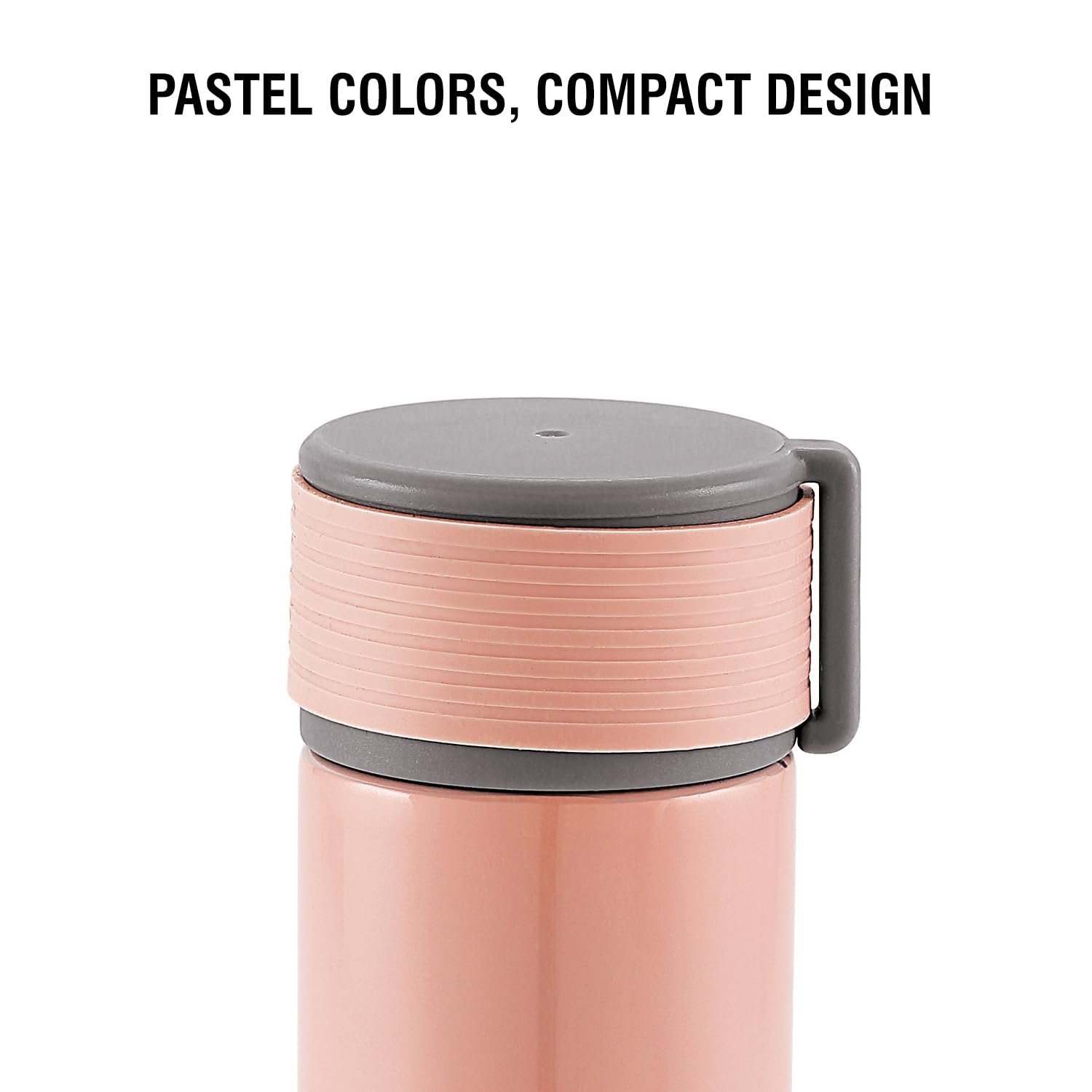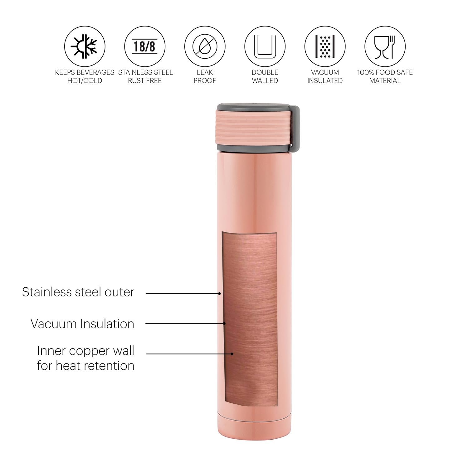 - Vacusteel Technology comes with double stainless wall with Copper coating on the inside to minimize loss of temperature and keep beverages hot or cold for a prolonged period of time.