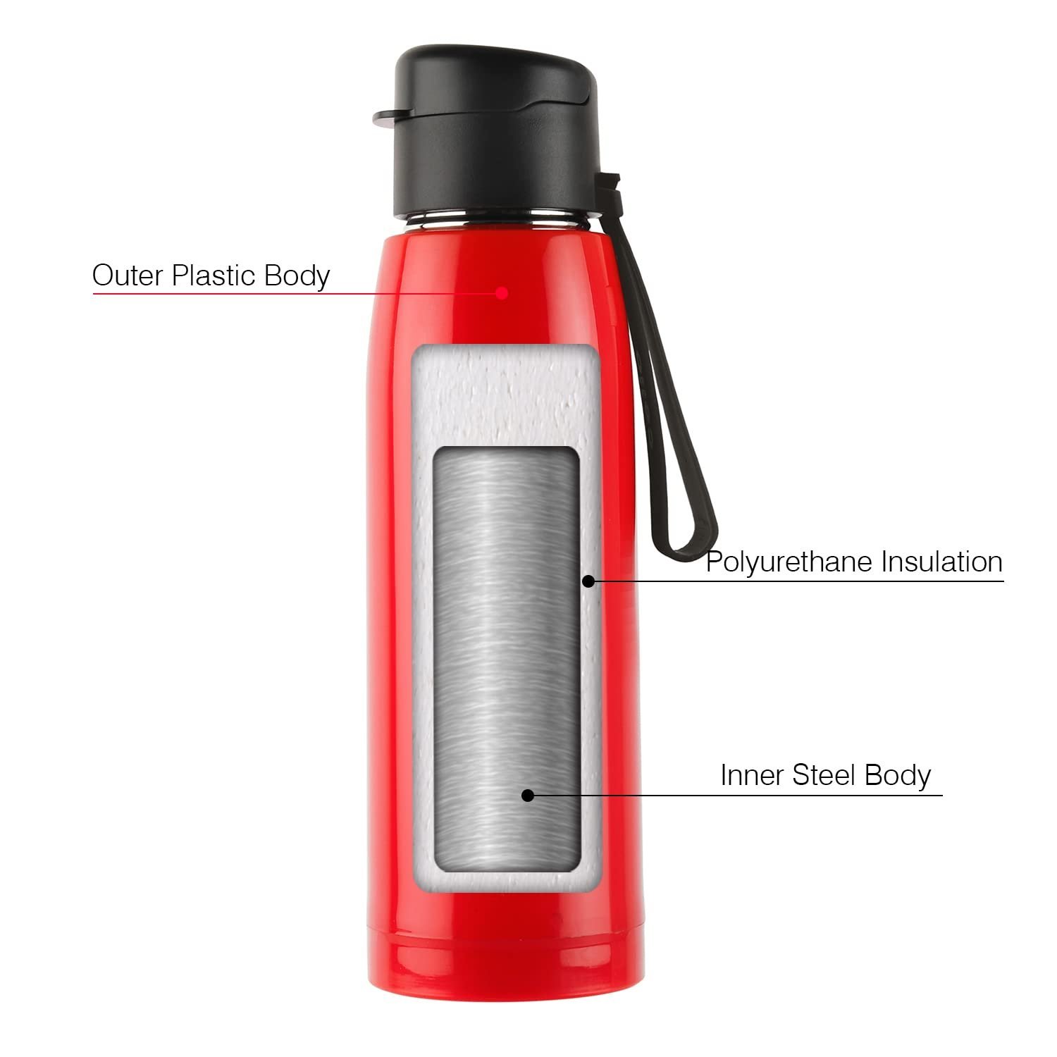 • Innovative Design: Crafted to perfection, this bottle combines an inner steel layer with an outer plastic layer and features polyurethane insulation for storing cold beverages. It's 100% BPA-free and non-toxic, ensuring your drinks remain untainted by oxidation or metallic taste.